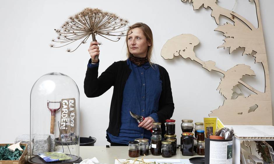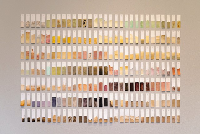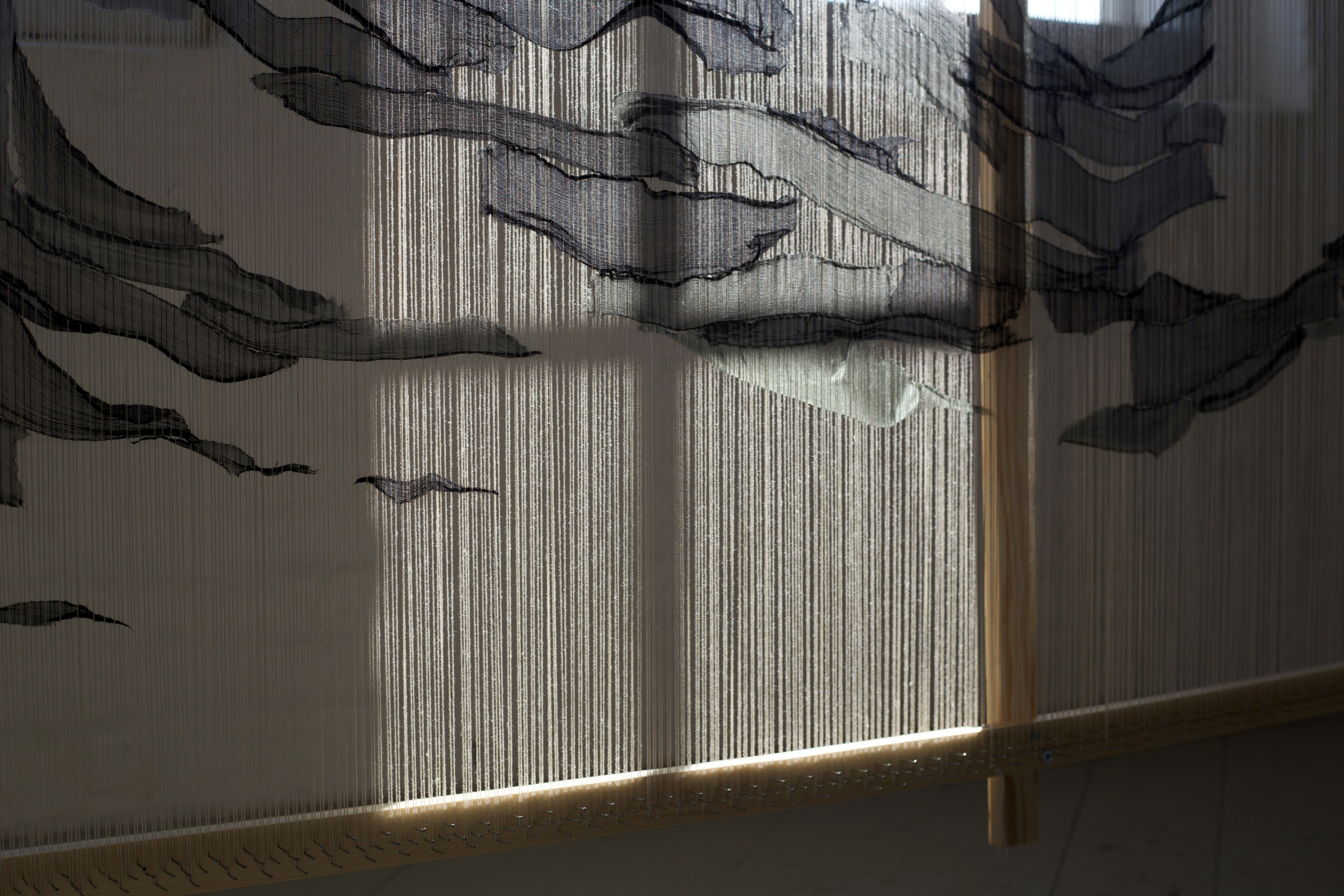 Statens Værksteder for Kunst Strandgade 27B, København K, DanmarkEllen Ahnfelt-Rønne arbejder i rammevæve, som hun selv bygger. Hun væver med en helt sart og tynd silkechiffon, som hun til udstillingen har indfarvet med naturlige plantematerialer i indfarvningsværkstedet.