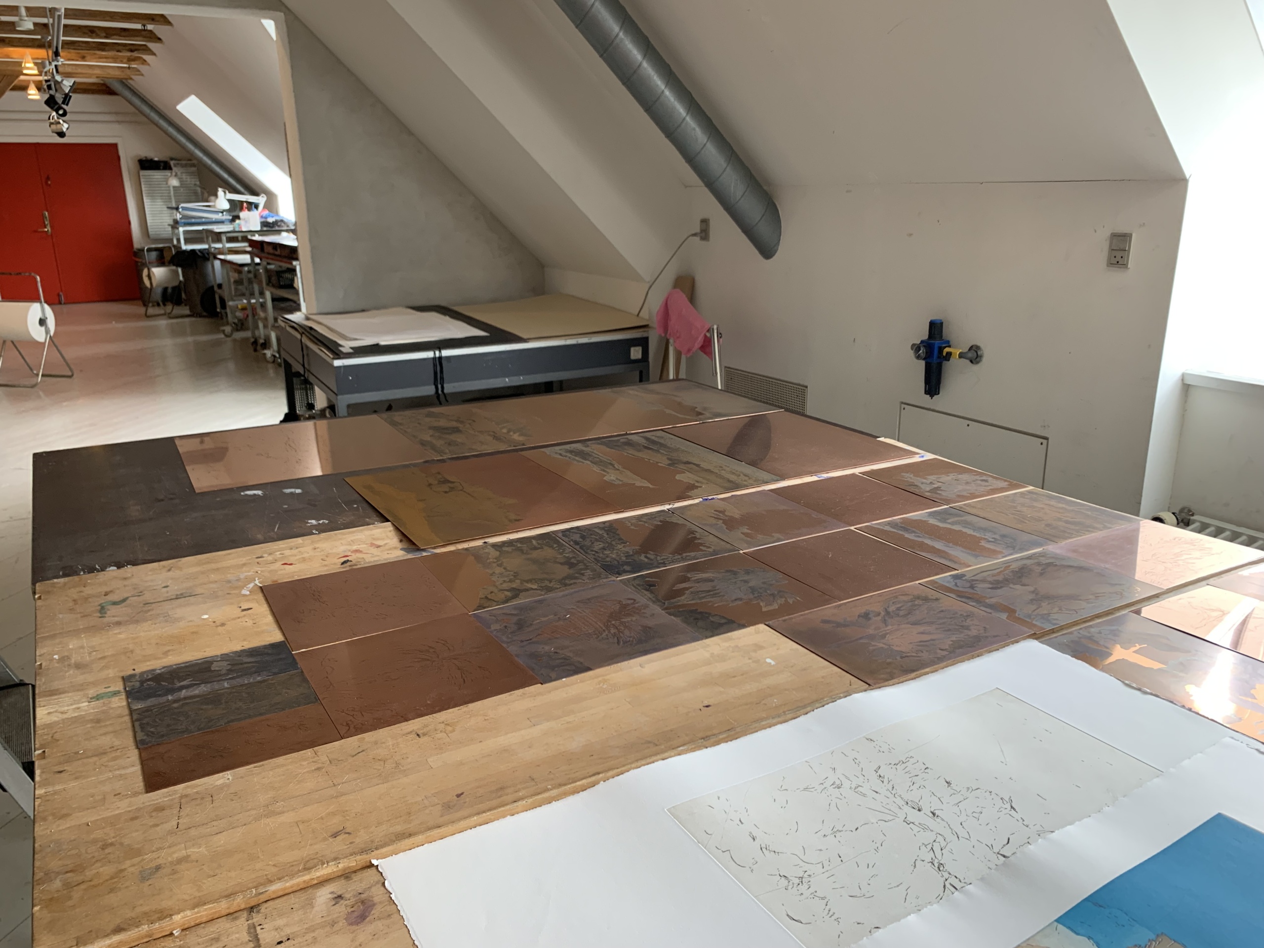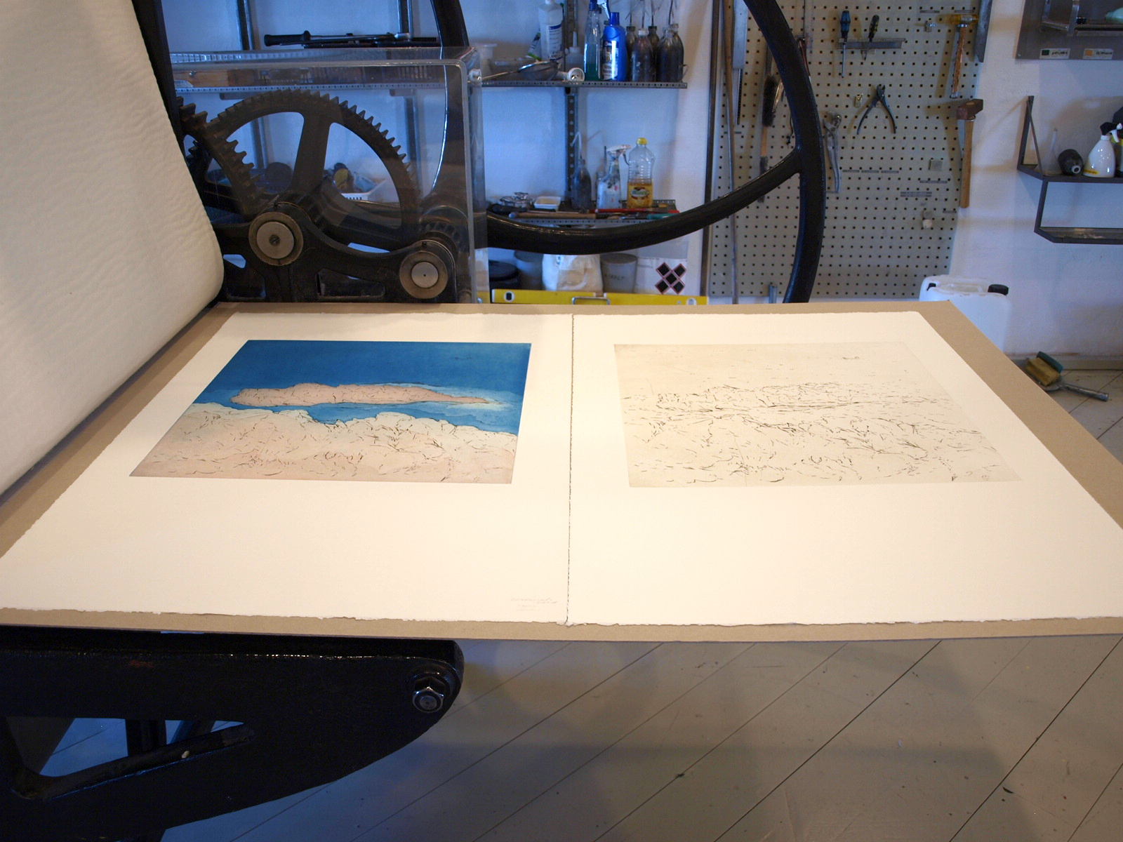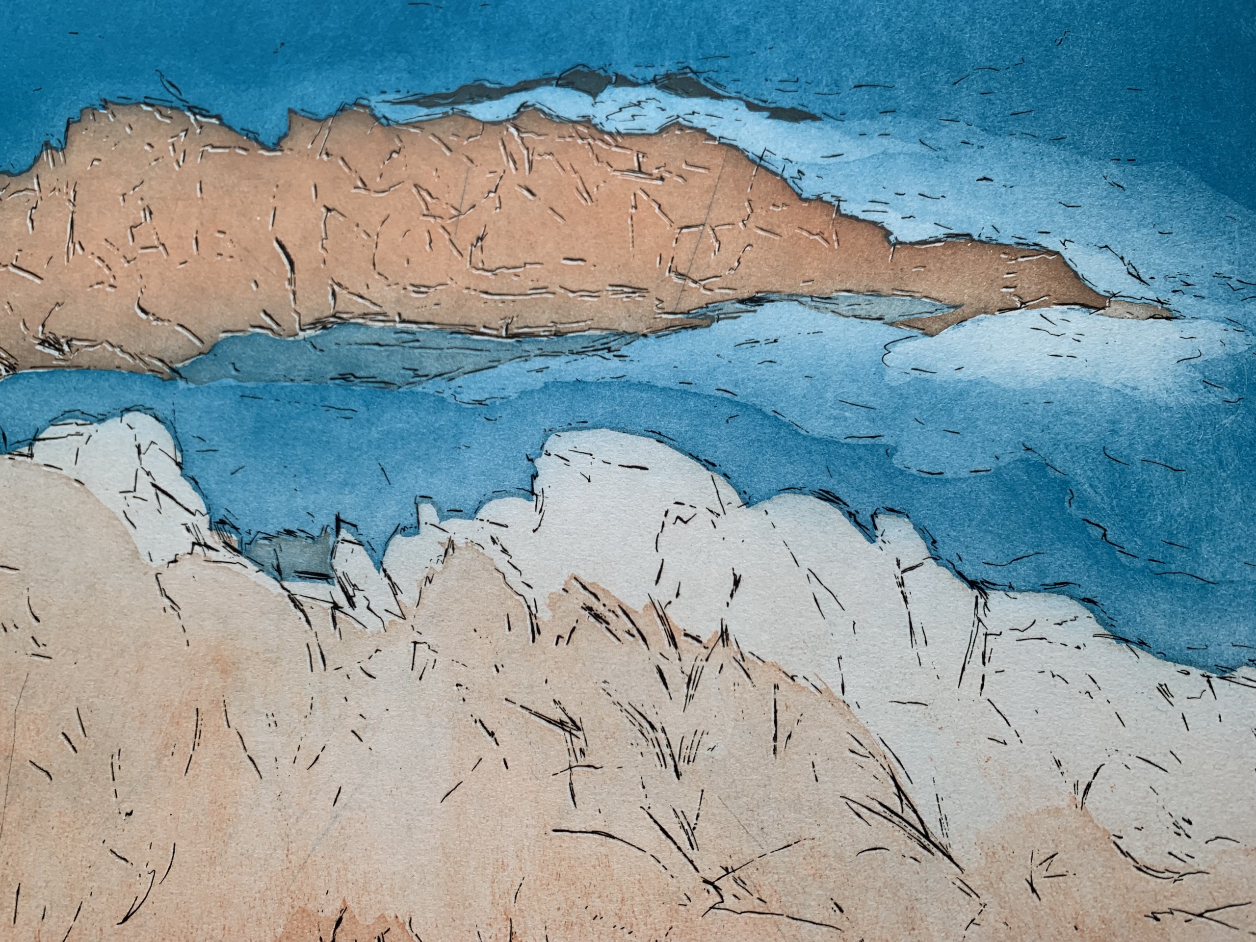 Med udgangspunkt i 30 basisraderinger (store og små) fra både Bornholm og Italien har jeg i grafisk værksted ætset dem, eksperimenteret med ætsetider og videreudviklet de enkelte raderinger med farveplader i akvatinteteknikken.