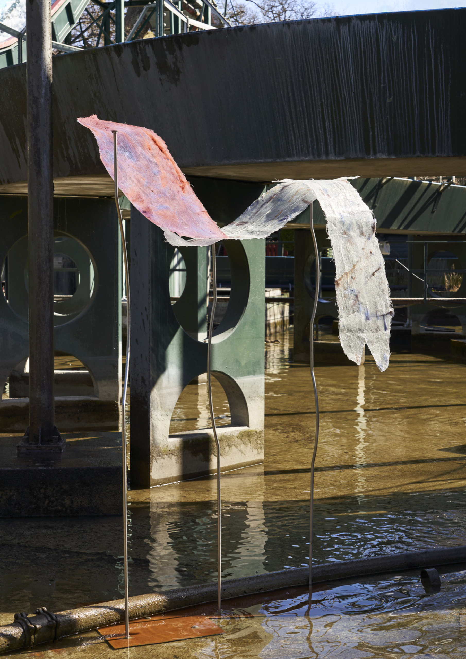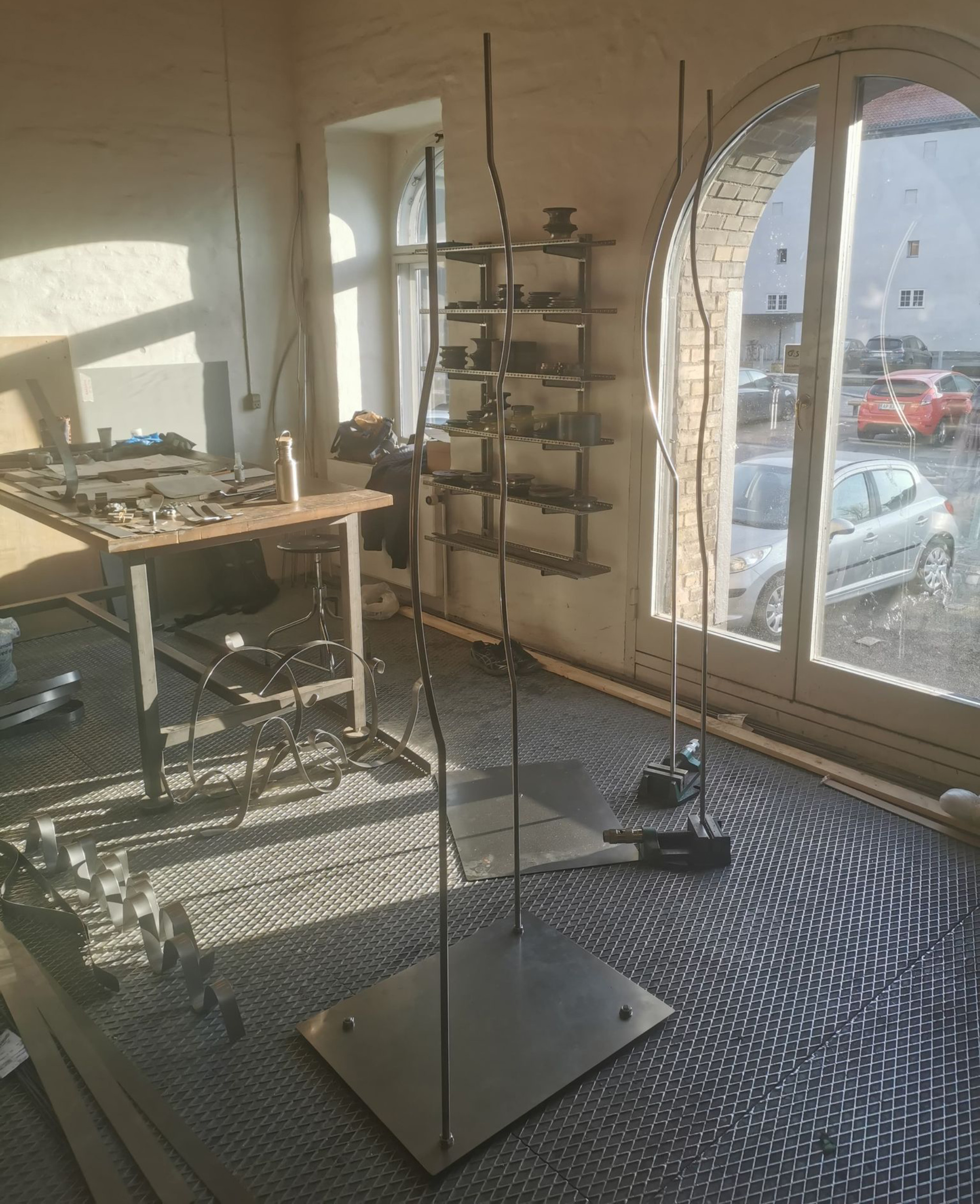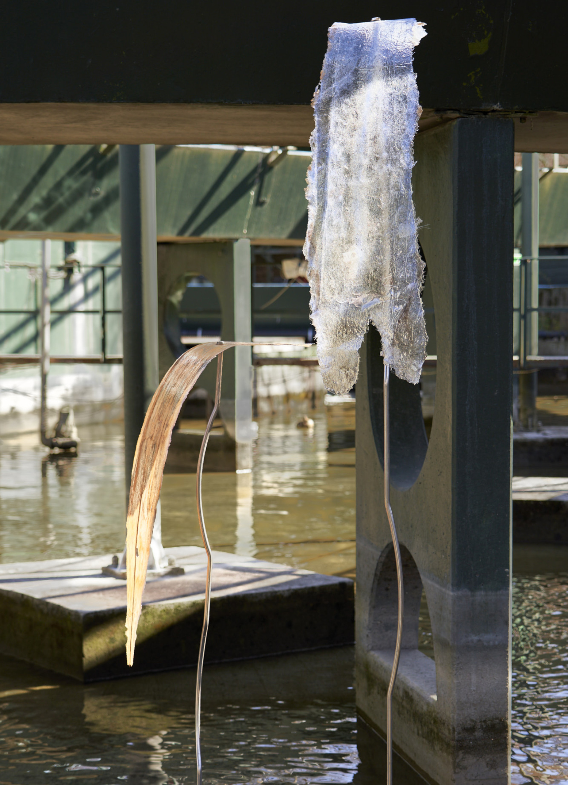 Til udstillingen bliver skulpturerne placeret i vandet, og ”vokser op” for at støtte og gribe afstøbningerne. I og med skulpturerne skal modstå vind og vejr er stængerne af rustfrit stål (14 mm massivt), som Raffn har valset og bukket ud i passende buer for at skabe et mere organisk udtryk, der også harmoniserer den omgivende, brutalistiske arkitektur. Der skal en hel del flere kræfter til end med almindeligt stål, da rustfrit er mere sejt. Det var derfor også nødvendigt at slibe enderne på stængerne lidt til for at få drejet gevind i for oven og forneden. På den måde kan stængerne monteres på en metalfod (beskåret på klippemaskinen) med møtrikker forneden og til glasfiberen foroven. For at gøre fundamentet jævnt blev der boret to ekstra huller i hjørnerne samt én i midten med en kort gevindstang, og planskive+møtrik på hver side. Stængerne kan således på- og afmonteres i forskellige konstellationer.
