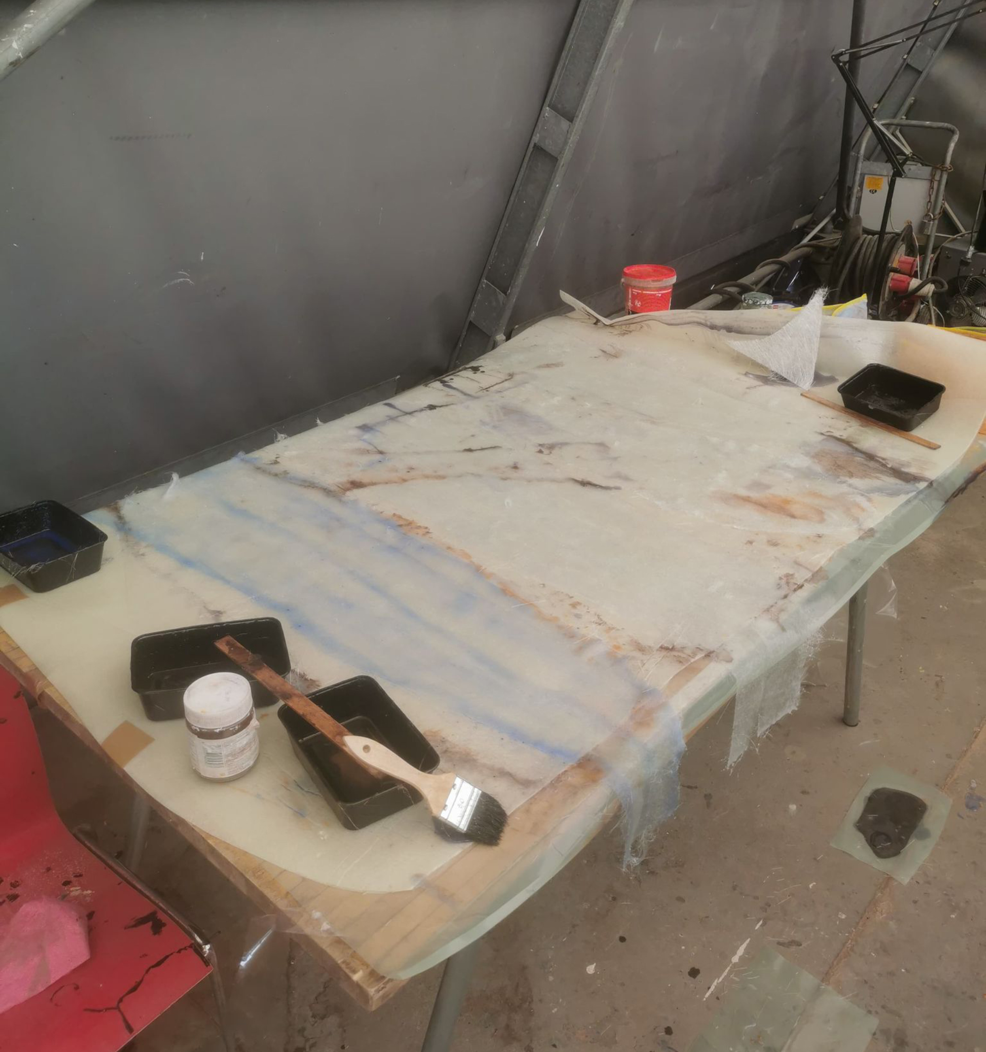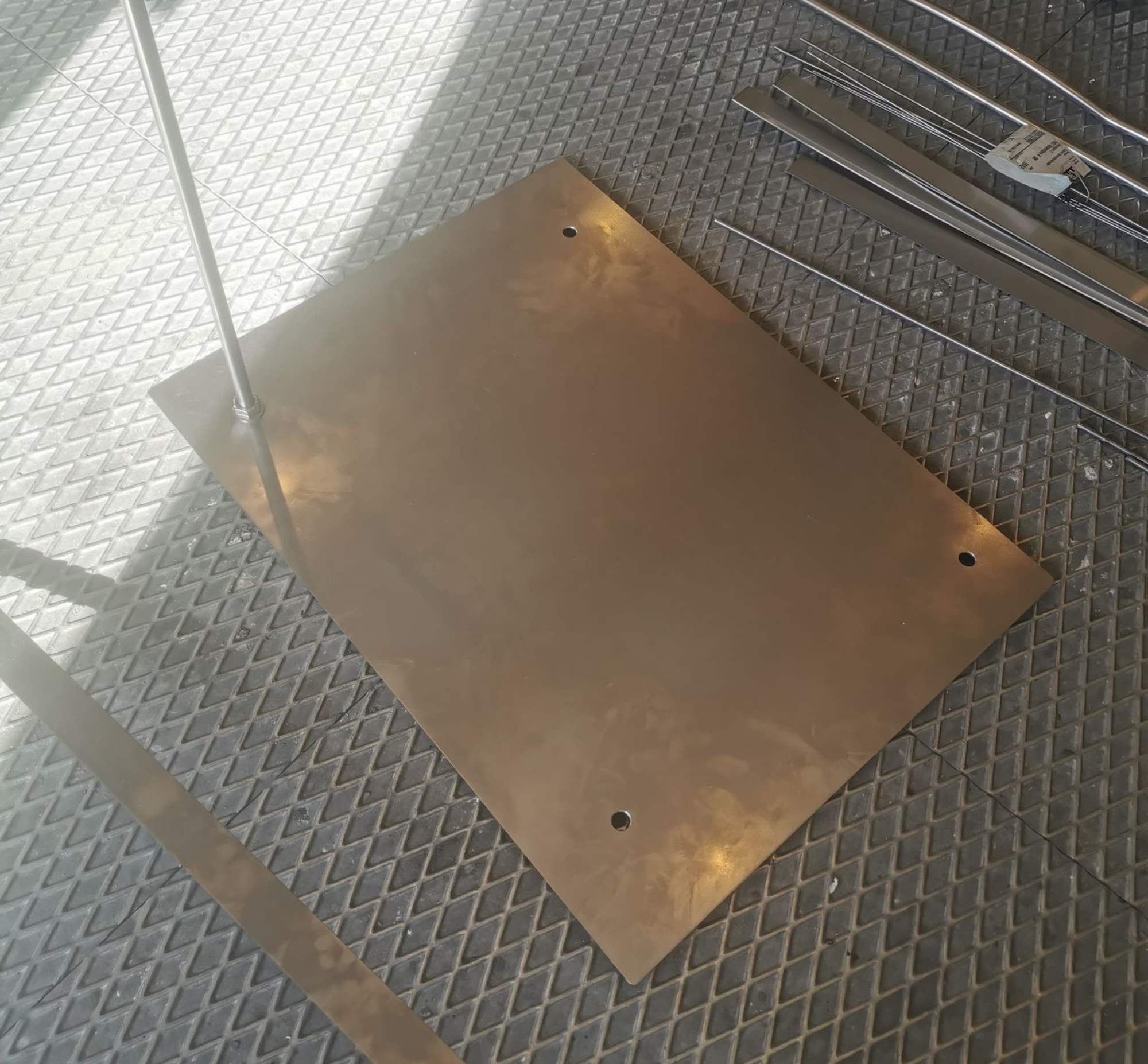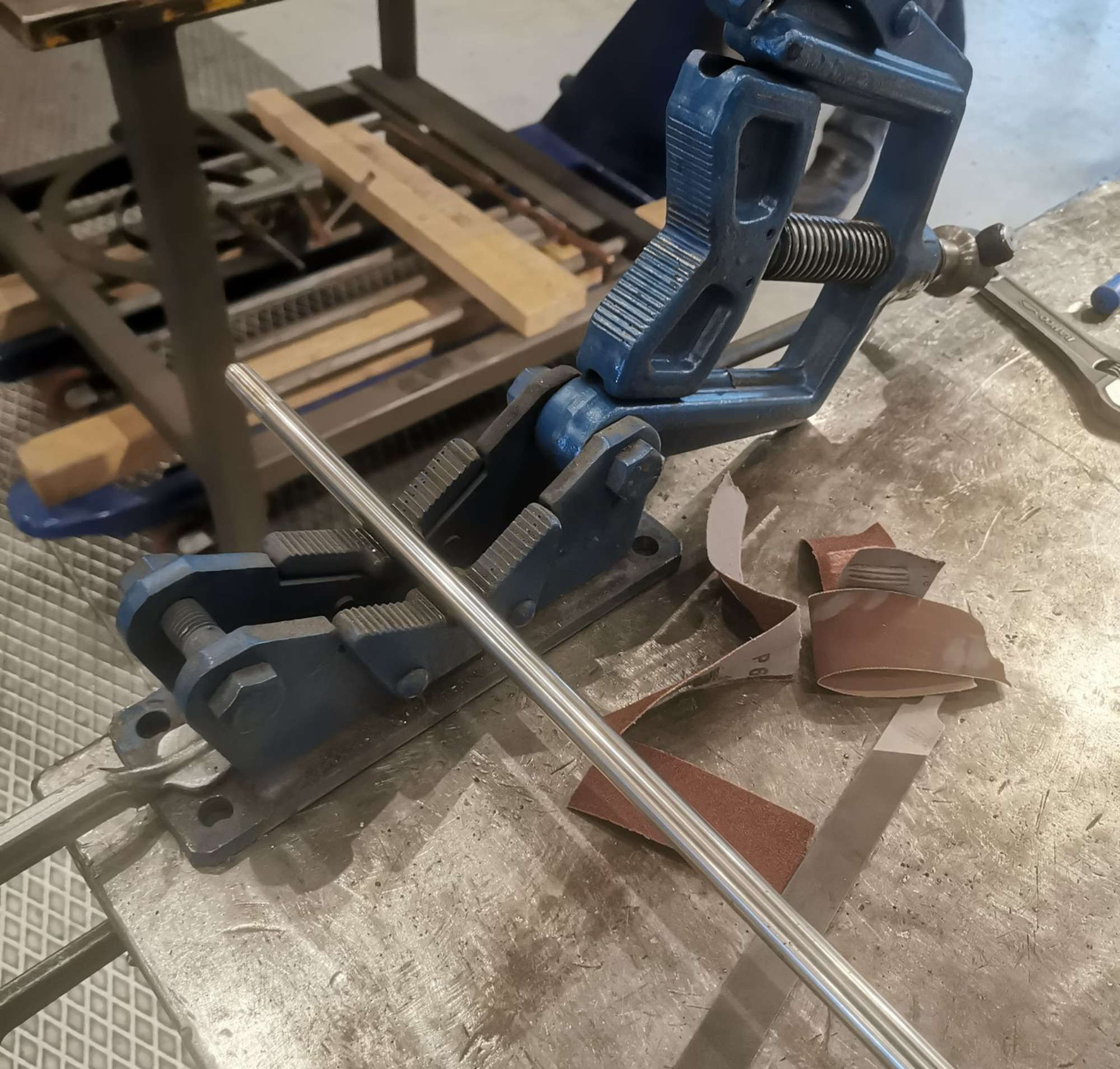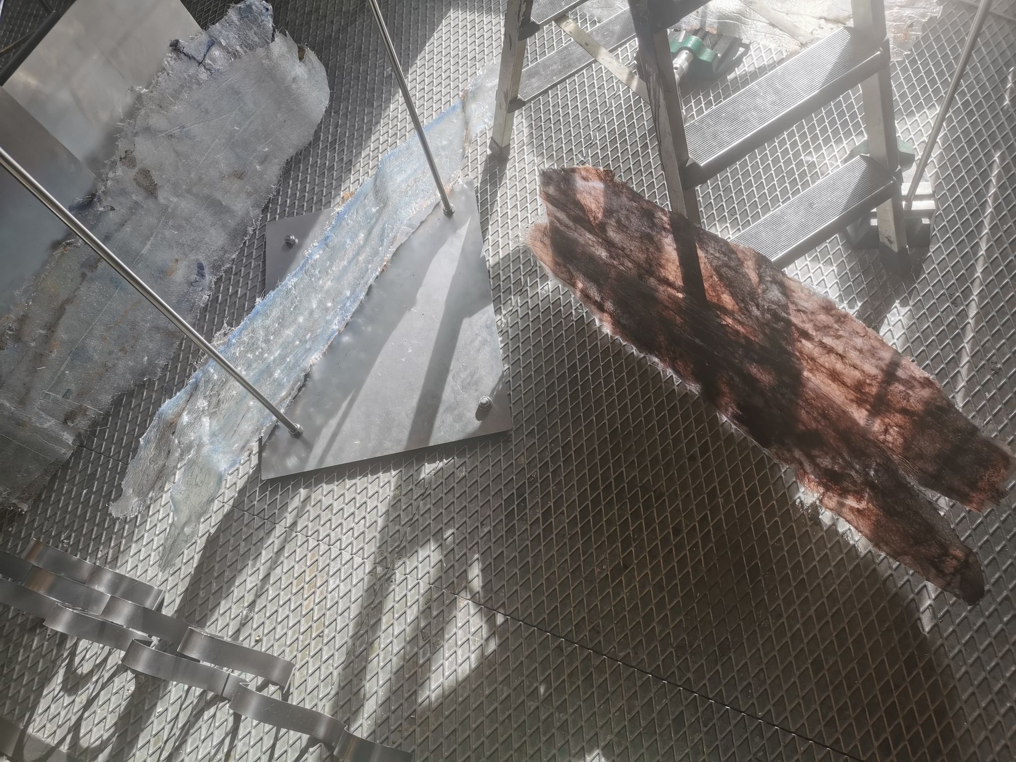 Til udstillingen bliver skulpturerne placeret i vandet, og ”vokser op” for at støtte og gribe afstøbningerne. I og med skulpturerne skal modstå vind og vejr er stængerne af rustfrit stål (14 mm massivt), som Raffn har valset og bukket ud i passende buer for at skabe et mere organisk udtryk, der også harmoniserer den omgivende, brutalistiske arkitektur. Der skal en hel del flere kræfter til end med almindeligt stål, da rustfrit er mere sejt. Det var derfor også nødvendigt at slibe enderne på stængerne lidt til for at få drejet gevind i for oven og forneden. På den måde kan stængerne monteres på en metalfod (beskåret på klippemaskinen) med møtrikker forneden og til glasfiberen foroven. For at gøre fundamentet jævnt blev der boret to ekstra huller i hjørnerne samt én i midten med en kort gevindstang, og planskive+møtrik på hver side. Stængerne kan således på- og afmonteres i forskellige konstellationer.